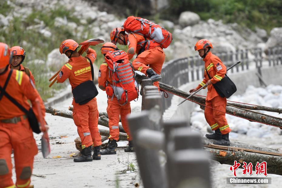 9月6日,四川甘孜州瀘定縣磨西鎮(zhèn),甘孜州森林消防支隊康定中隊隊員通過簡易木橋,深入山區(qū)開展救災工作。9月5日,四川瀘定發(fā)生6.8級地震。 中新社記者 張浪 攝