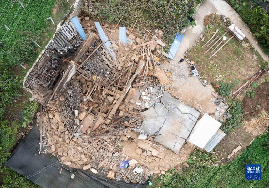 9月7日,在雅安市石棉縣王崗坪彝族藏族鄉(xiāng)幸福村二組,四川眉山消防救援隊(duì)隊(duì)員幫助村民在倒塌的房屋中找尋物品(無人機(jī)照片)。新華社記者 才揚(yáng) 攝