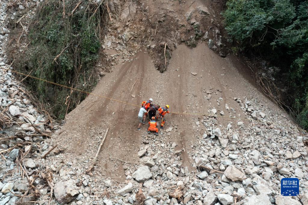 9月7日,在四川省甘孜州瀘定縣磨西鎮(zhèn)附近,四川省成都市消防救援支隊(duì)的救援人員轉(zhuǎn)移被困群眾。 新華社記者 沈伯韓 攝