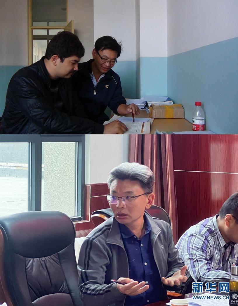 這是一張拼版照片:上圖為2014年6月23日,趙焱(右)與和田縣第二中學(xué)青年教師一起交流(新華網(wǎng)發(fā) 受訪對象供圖);下圖為2022年3月31日,趙焱(左)在玉樹州教育局參加玉樹州高三備考會(huì)。(新華網(wǎng)發(fā) 受訪對象供圖)