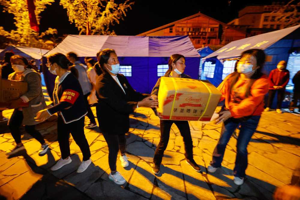 9月5日晚,在磨西鎮(zhèn)的受災(zāi)群眾臨時(shí)安置點(diǎn),人們在傳遞救災(zāi)物資。