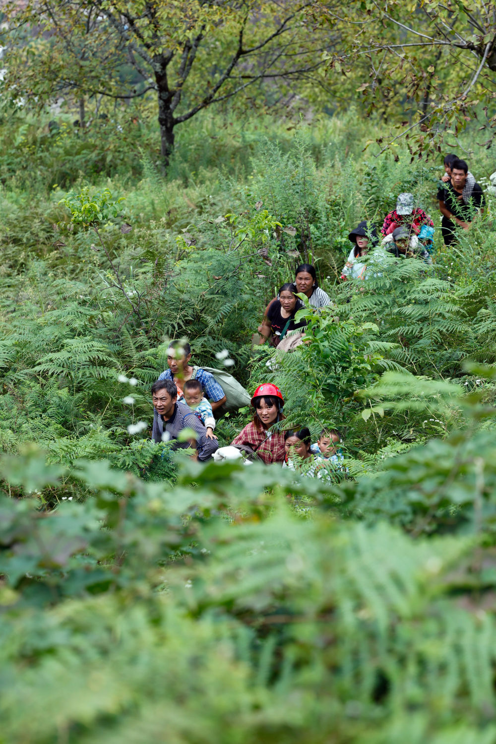 穿越了十余個(gè)這樣的路段,遠(yuǎn)遠(yuǎn)看到山下有人影晃動在齊人高的綠色植物之間,再往山上走。向?qū)дf他們是從灣東村一組上來的被困群眾。透過長焦鏡頭看到,一名精壯的小伙子赤裸上身,拿著鐮刀走在最前面為鄉(xiāng)親們開路,鄉(xiāng)親們跟在后頭,有的還背著孩子。幾名救援人員在變形的公路護(hù)欄旁接爬上來的人,一名背著孩子的婦女一握到解放軍戰(zhàn)士的手就哭了出來……待這批村民全部上到公路上后,救援人員護(hù)送他們返回紅花崗附近可以停直升機(jī)的疏散地點(diǎn),然后再去山下接人。