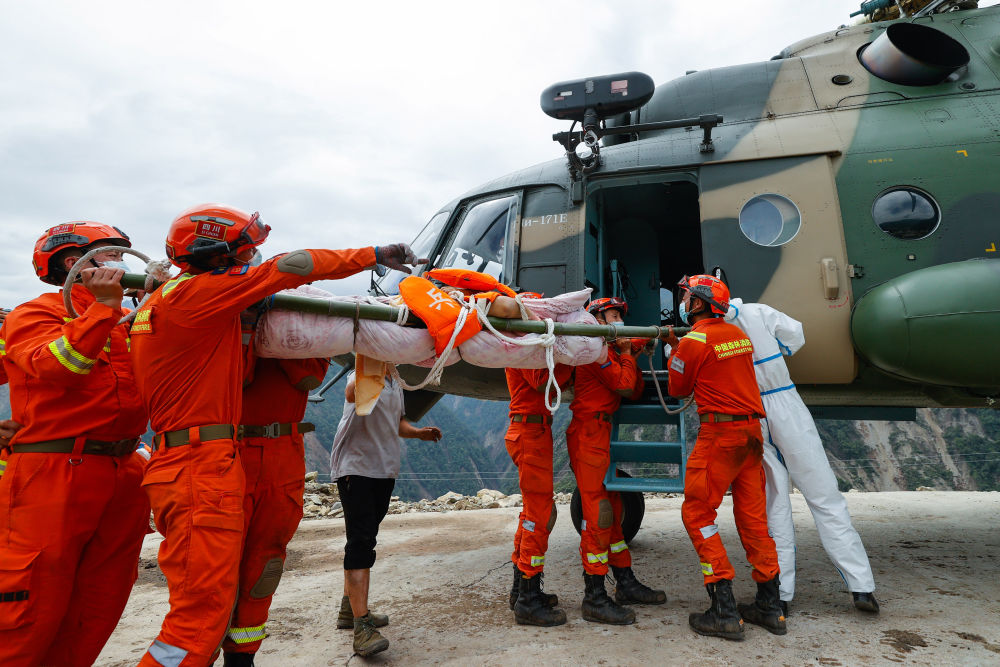 9月6日,救援人員抬著一名從灣東村疏散出來的受傷村民,準(zhǔn)備通過直升機(jī)將其運(yùn)出。