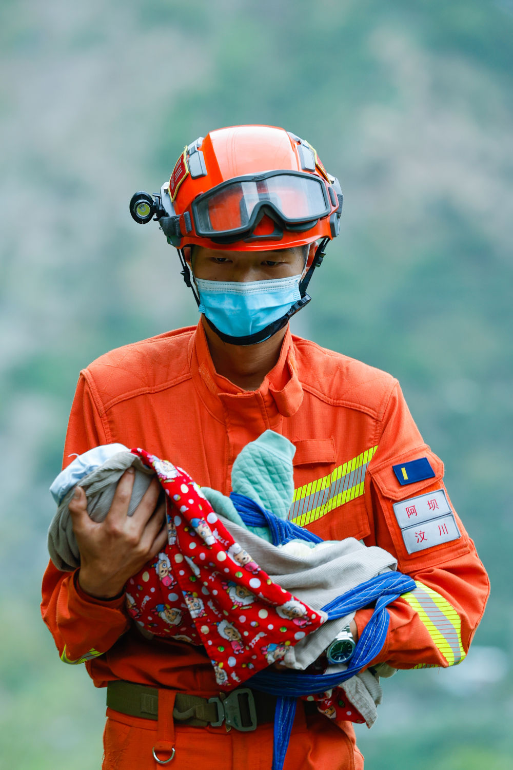 9月6日,阿壩森林消防支隊(duì)汶川大隊(duì)隊(duì)員張自立抱著一名從灣東村疏散出來的兩個(gè)月大的嬰兒。