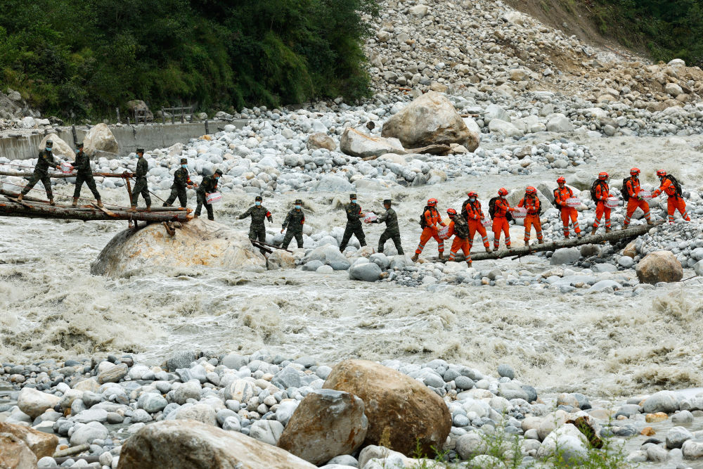 9月8日,在磨西鎮(zhèn)附近,救援人員站在臨時(shí)架設(shè)的小橋上向河對岸的村民運(yùn)送生活物資。