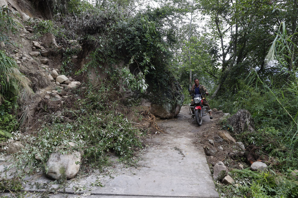 9月8日,青崗坪村村民騎著摩托車通過被滾落的山石阻擋的上山路。
