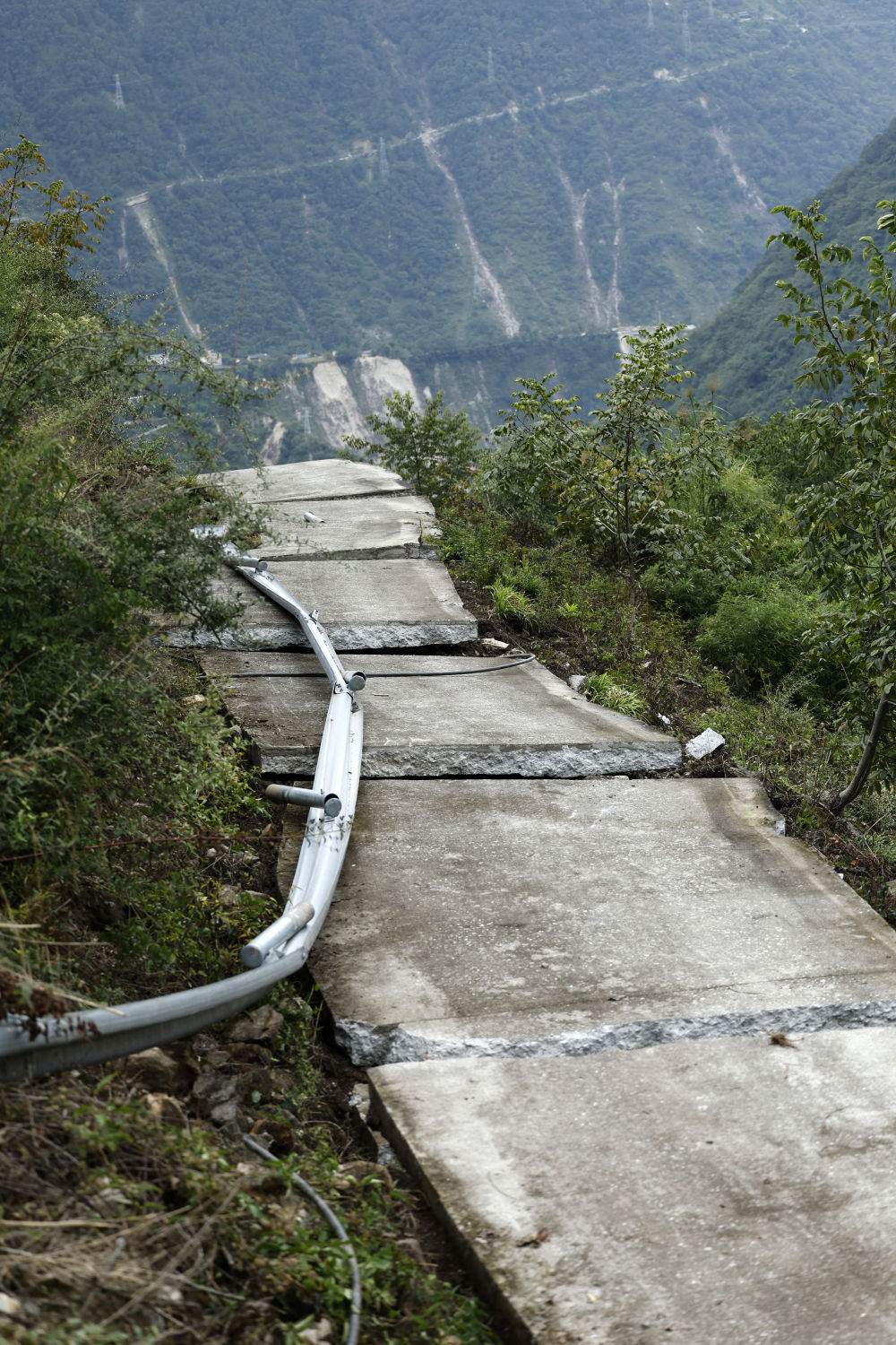 得知我們要去共和村,村干部叫來三輛摩托車,給車加了點(diǎn)汽油,送我們上去。上山的路本是只能容一輛汽車通過的水泥硬化路,經(jīng)過地震,沿途路面或裂開、或傾斜、或拱起、或塌陷,滑落的巨石和被撕扯下來的樹木把小路擋得只容摩托車通過,另一側(cè)就是深深的山溝。