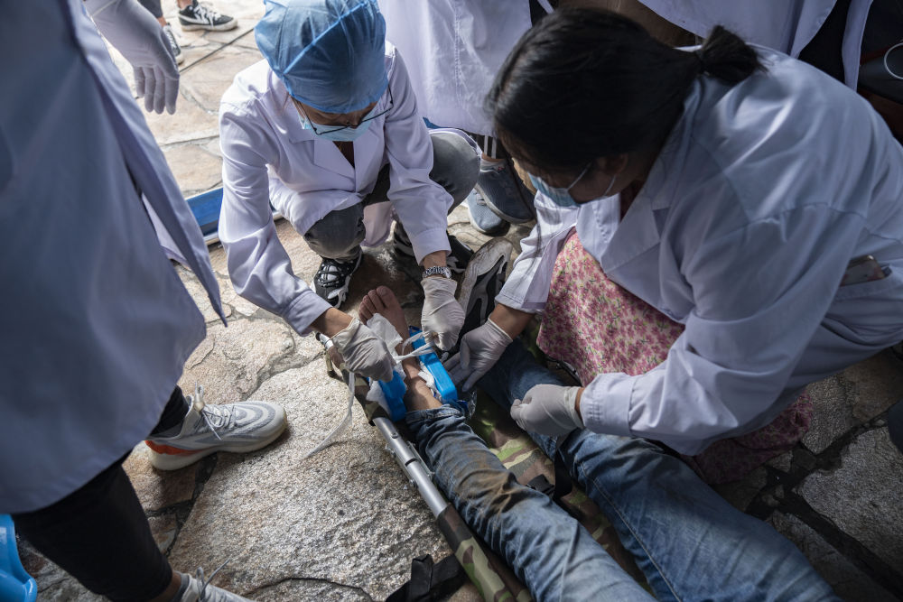 9月6日,在磨西鎮(zhèn)海螺溝廣場受災(zāi)群眾臨時(shí)安置點(diǎn),醫(yī)護(hù)人員為傷員包扎。