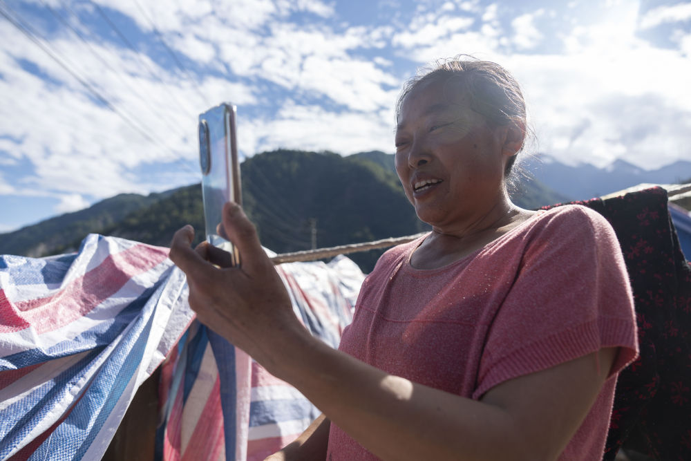 9月10日,在幸福村,技術(shù)人員安裝衛(wèi)星便攜站后,村民在與家人用手機(jī)進(jìn)行視頻通話。