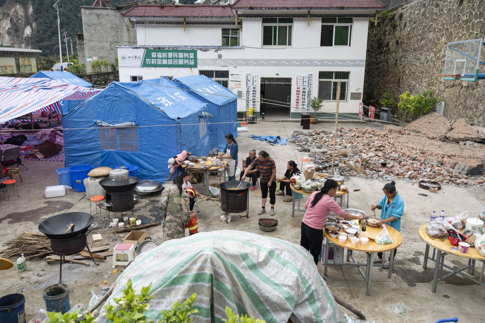 9月7日,在草科鄉(xiāng)政府安置點(diǎn)內(nèi),當(dāng)?shù)厝罕姙樵趫鼍仍藛T準(zhǔn)備飯菜。