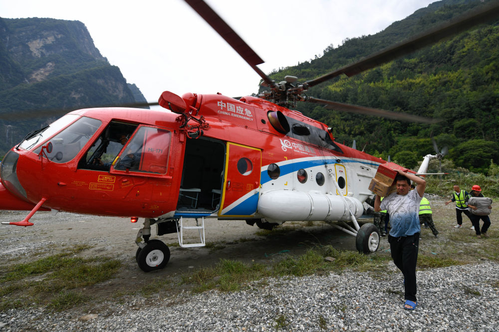 9月7日,搭載方便面和帳篷等救援物資的直升機(jī)抵達(dá)石棉縣草科鄉(xiāng),當(dāng)?shù)厝罕姲徇\(yùn)物資。