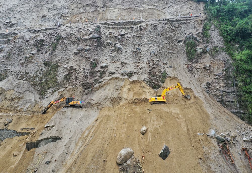 9月9日,搶險(xiǎn)人員在搶通磨西鎮(zhèn)附近道路。