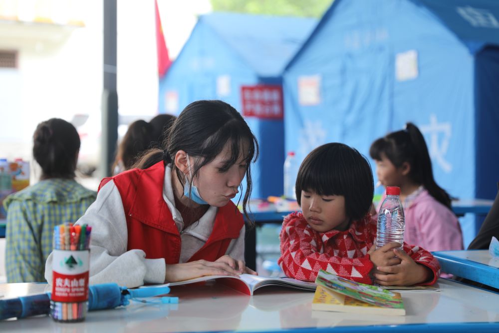 9月9日,在王崗坪鄉(xiāng)安置點(diǎn)內(nèi),志愿者在給小朋友講故事。