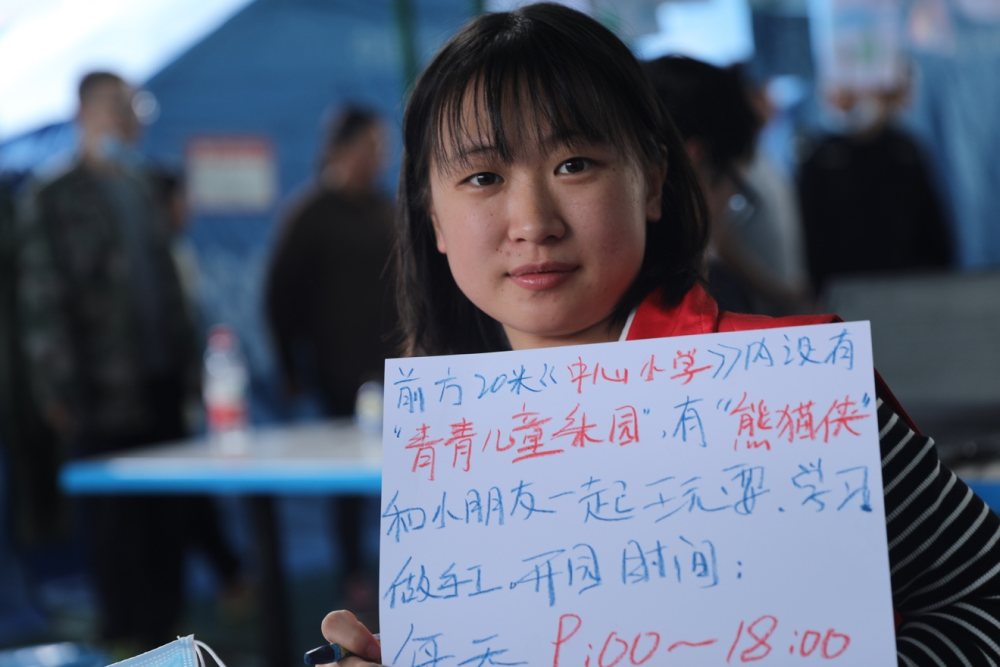 看到我手里的照相機(jī),他們十分好奇。一位叫駱雅萱的小朋友拉了拉我的衣角說:“姐姐,我想用你的相機(jī)給‘熊貓俠’拍一張照片好嗎?”“熊貓俠”是這里的一名志愿者,地震發(fā)生以來一直在安置點(diǎn)陪伴著小朋友們,大家都很喜歡她。我答應(yīng)了小朋友的請求,教她按下快門,看到自己拍的照片,她開心地給“熊貓俠”展示。