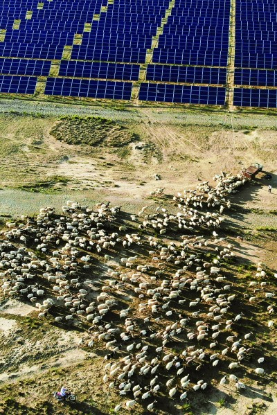 在青海省海南藏族自治州共和縣的塔拉灘光電園區(qū),恰卜恰鎮(zhèn)上塔邁村的藏族牧民索南卓瑪騎著摩托車穿行在深藍色的光伏板間,驅(qū)趕羊群回圈飲水。