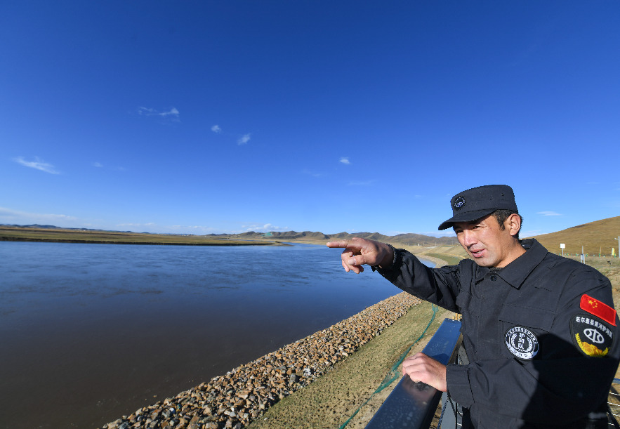 在四川省阿壩州若爾蓋縣,護(hù)河隊隊員在黃河邊觀察情況。新華社記者 王曦 攝