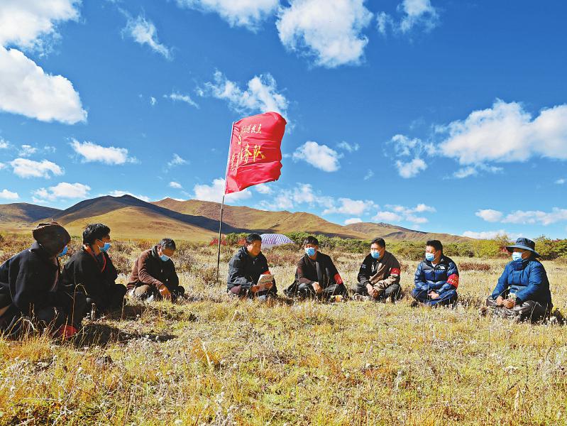10月20日,阿壩縣賈洛鎮(zhèn)勒坤瑪村一處遠牧點上,干部和牧民一道學習黨的二十大精神。尕讓澤登 攝