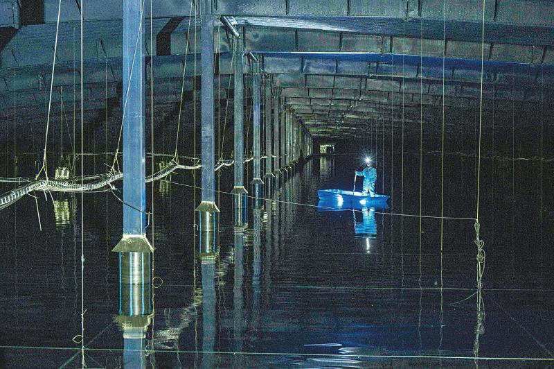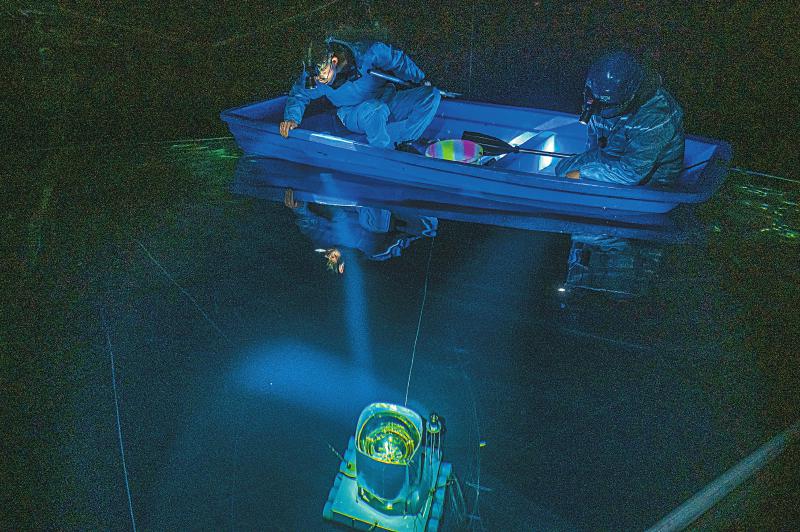 24日,陳明君和同事穿上潔凈服、戴上腳套,劃著小船進(jìn)入伸手不見五指的三號(hào)水池,他們要逐一檢查維護(hù)這里的探測(cè)器單元和電子學(xué)箱。船劃到指定位置,黑暗中陳明君的頭燈光束直射水底,水下碩大的探測(cè)器單元核心設(shè)備——光電倍增管,被照得清晰可見,他和同事一起用“鉤子”把光電倍增管拉起,進(jìn)行檢查?!八乩锏纳疃仁?.5米,這些純凈水的透明度比自來水高三倍以上,切倫科夫光就從里面捕獲?!标惷骶嬖V記者。