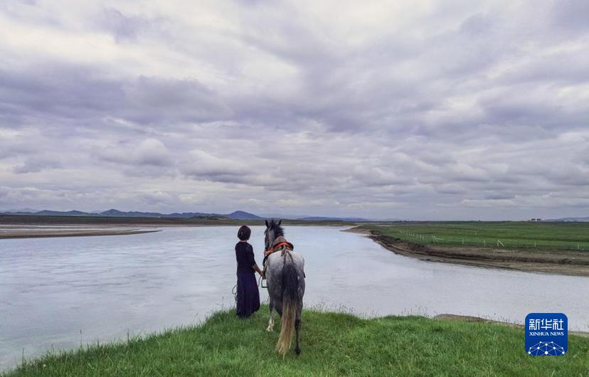 在若爾蓋縣麥溪鄉(xiāng)嘎沙村,一位牧民牽著馬眺望黃河(2022年7月26日攝)。她所在的位置是黑河入黃河口,也是黃河出川口。新華社記者 江宏景 攝