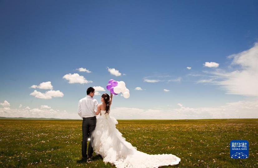 四川若爾蓋濕地國(guó)家級(jí)自然保護(hù)區(qū)鮮花盛開(kāi)時(shí)節(jié),一對(duì)情侶在拍攝婚紗照(2022年6月24日攝)。新華社記者 江宏景 攝