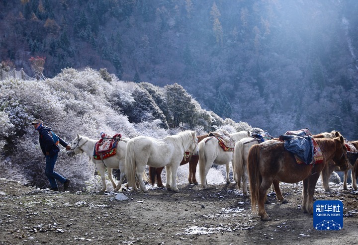 11月8日,工作人員在四姑娘山長(zhǎng)坪溝景區(qū)內(nèi)牽馬行走。新華社記者 劉瓊 攝