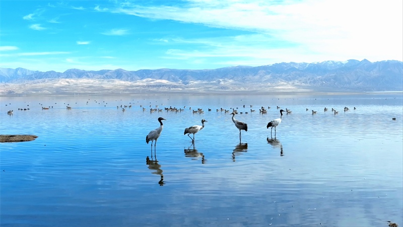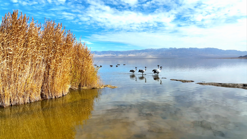 初冬時節(jié),在青海省海西蒙古族藏族自治州烏蘭縣都蘭湖國家濕地公園內,四只國家一級保護動物黑頸鶴,踏著黑色細長的腿在湖中閑庭信步,與斑頭雁、赤麻鴨一起嬉戲覓食,盡顯柴達木盆地濕地生態(tài)之美。