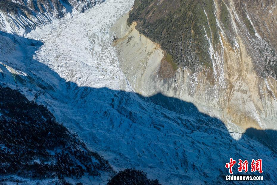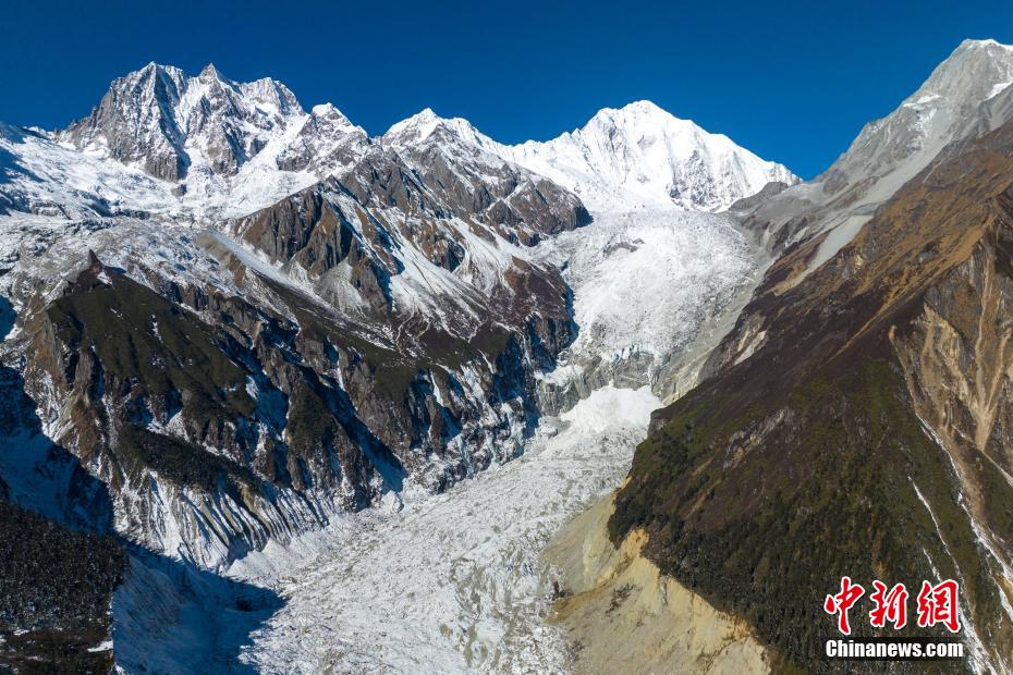 1月9日,中新網(wǎng)記者走進(jìn)四川瀘定海螺溝景區(qū)核心區(qū),航拍經(jīng)歷了2022年“9.5”瀘定6.8級地震的貢嘎山海螺溝冰川冰瀑布,雄偉壯觀依舊。