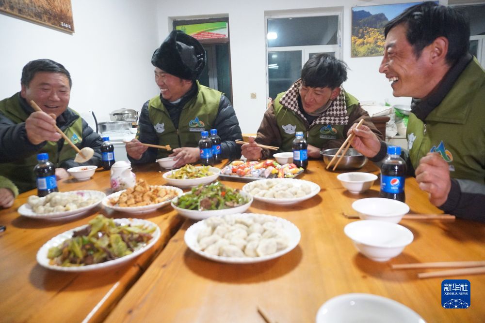 1月14日晚,管護(hù)員們?cè)谝黄鸪燥溩印P氯A社記者 周盛盛 攝