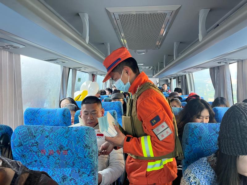 在普達(dá)措國(guó)家公園停車場(chǎng),消防指戰(zhàn)員向游客們發(fā)放《防火宣傳冊(cè)》,并將游客的火機(jī)進(jìn)行收納統(tǒng)一保管。