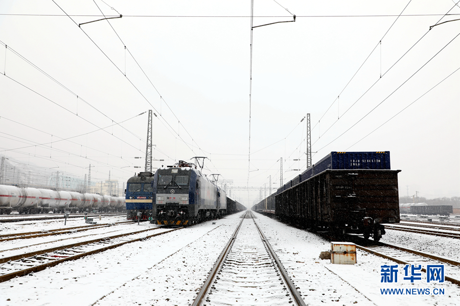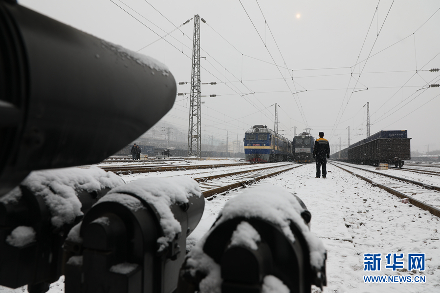 調(diào)車人員在雪中進(jìn)行調(diào)車作業(yè)。新華網(wǎng) 鐵萬鋼 攝