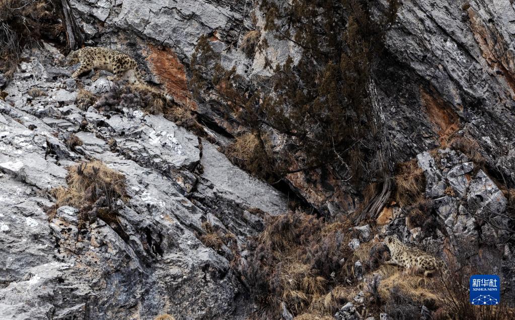 2月21日在青海省玉樹藏族自治州雜多縣昂賽鄉(xiāng)境內(nèi)的昂賽大峽谷內(nèi)拍攝的兩只雪豹。新華社記者 費(fèi)茂華 攝
