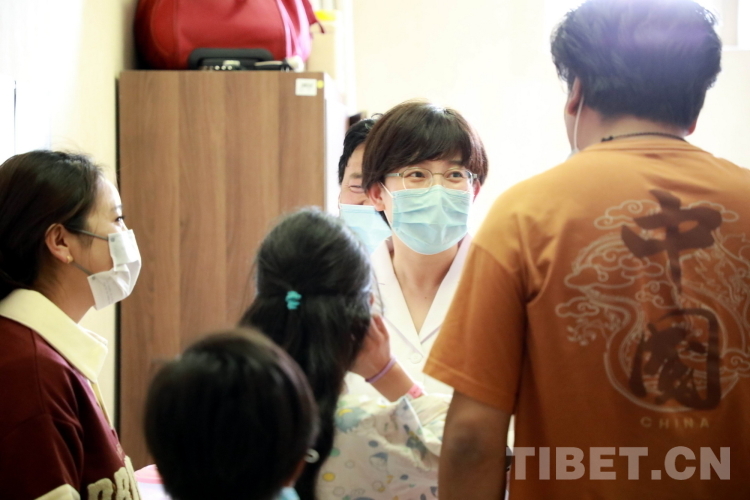 圖為北醫(yī)三院心臟外科病房護(hù)士長張亞飛為來自青海省果洛藏族自治州的先心病患兒及患兒家屬介紹術(shù)后恢復(fù)注意事項(xiàng) 攝影:劉莉