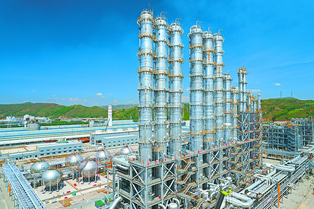碧藍(lán)天空下,一個(gè)個(gè)標(biāo)準(zhǔn)化車間錯(cuò)落有致,一排排提純精餾塔巍然聳立,粗細(xì)不一的銀色管道在廠區(qū)內(nèi)相互編織盤(pán)旋,罐區(qū)在“綠電”驅(qū)動(dòng)下各自忙碌,運(yùn)轉(zhuǎn)的循環(huán)水站奏響春季“生產(chǎn)之歌”……