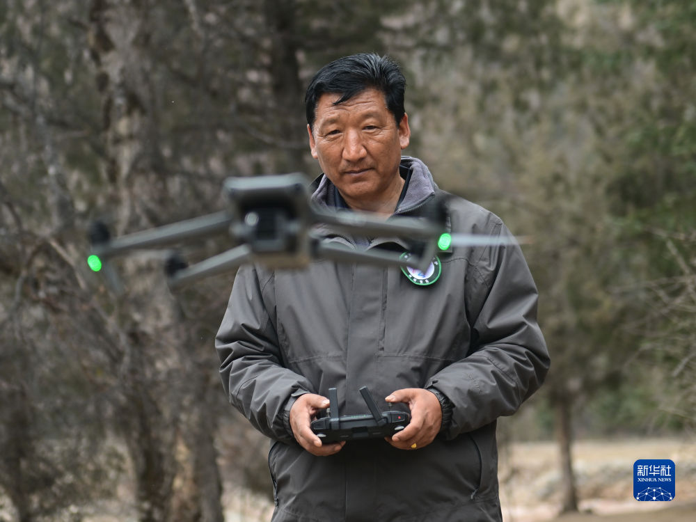 3月24日,在青海省黃南藏族自治州麥秀林場(chǎng),護(hù)林員使用無(wú)人機(jī)巡護(hù)林區(qū)。新華社記者 王艷 攝