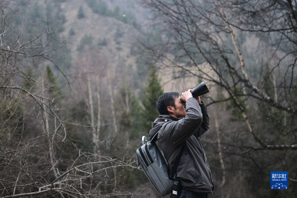 3月24日,在青海省黃南藏族自治州麥秀林場(chǎng),護(hù)林員使用望遠(yuǎn)鏡巡護(hù)林區(qū)。新華社記者 張龍 攝