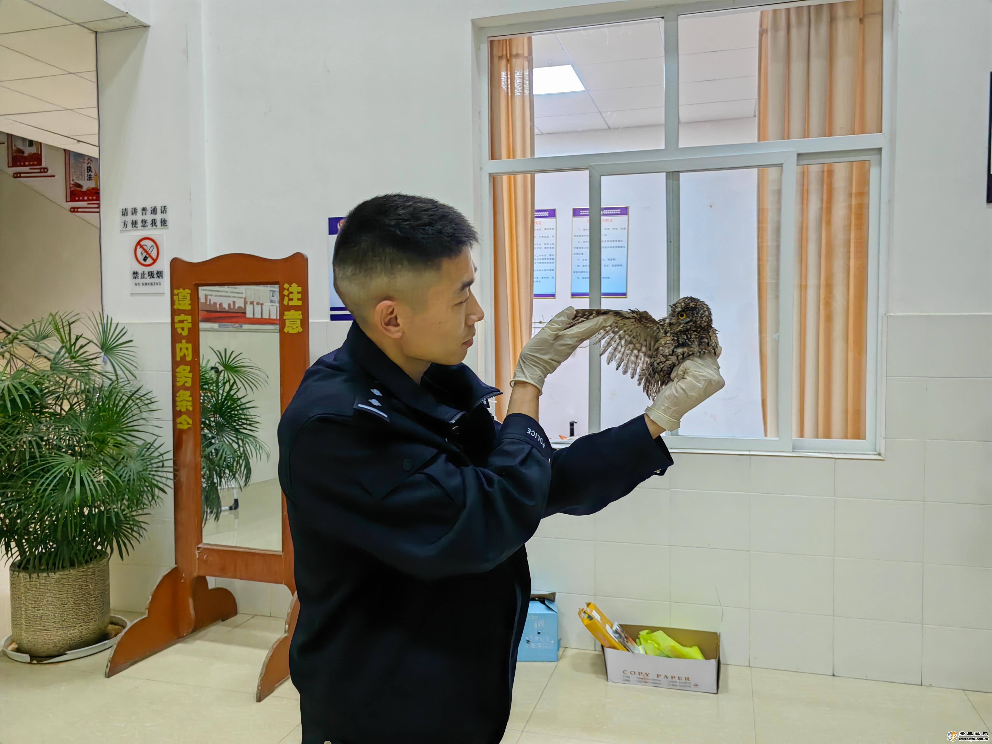經(jīng)民警仔細查看并咨詢相關(guān)林業(yè)專業(yè)人員,確定這是一只紅角鸮,屬國家二級野生保護動物,因部分羽毛是濕的,故無法飛行。當晚,民警待其羽毛干透后再次進行了仔細檢查,未發(fā)現(xiàn)體表傷,具備放生條件,于是民警將該紅角鸮帶至野外進行了放生。