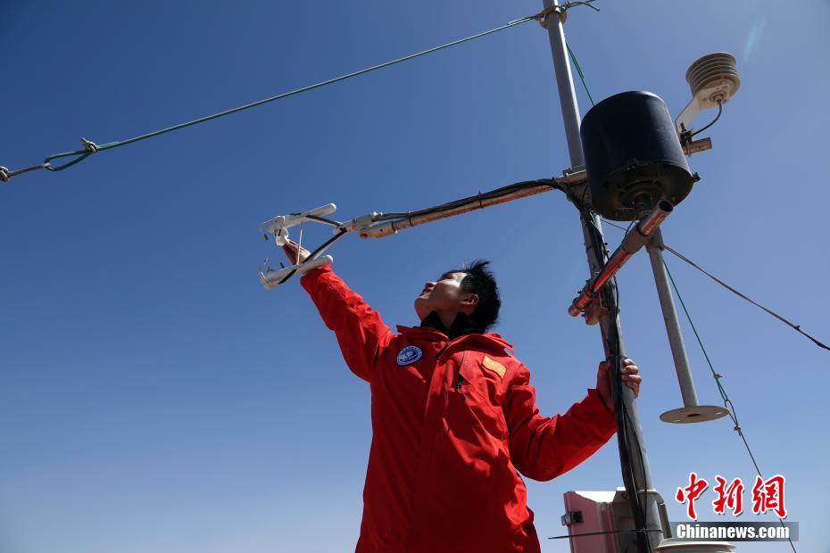 圖為觀測站現(xiàn)場,第二次青藏科考隊員、中科院空天院博士生陳舊對觀測設備進行維護。 中新社記者 孫自法 攝