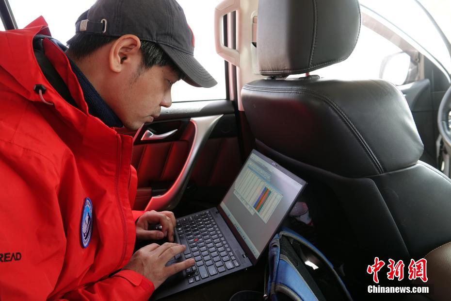 觀測站現(xiàn)場,第二次青藏科考隊員、中科院空天院鄭超磊副研究員隨即在車上進行數據初步檢查處理工作。中新社記者 孫自法 攝