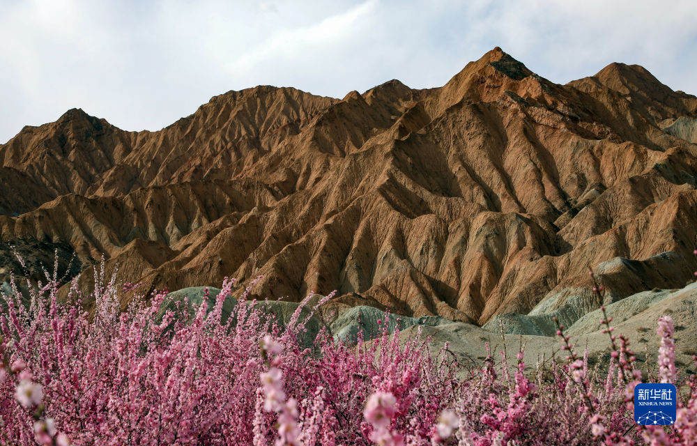 4月8日拍攝的青海貴德國家地質(zhì)公園丹霞地貌與盛開的春花。新華社記者 黃豁 攝