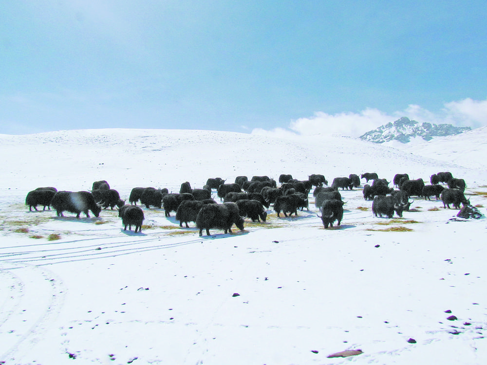4月3日,天空中還飄著雪花,汽車(chē)沿著盤(pán)山公路緩慢前行,過(guò)了許久,我們來(lái)到了青海省玉樹(shù)藏族自治州稱(chēng)多縣清水河鎮(zhèn)紅旗村境內(nèi),遠(yuǎn)處的山野上幾百頭牦牛映入眼簾,它們?cè)谘┌椎牟莸厣弦捠?,幾名牧工緊隨其后,慢慢驅(qū)趕著它們向前行……