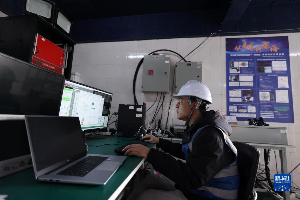 4月22日,工作人員在高海拔宇宙線觀測站觀測基地水切倫科夫探測器陣列處理實驗數(shù)據(jù)。新華社記者 金立旺 攝