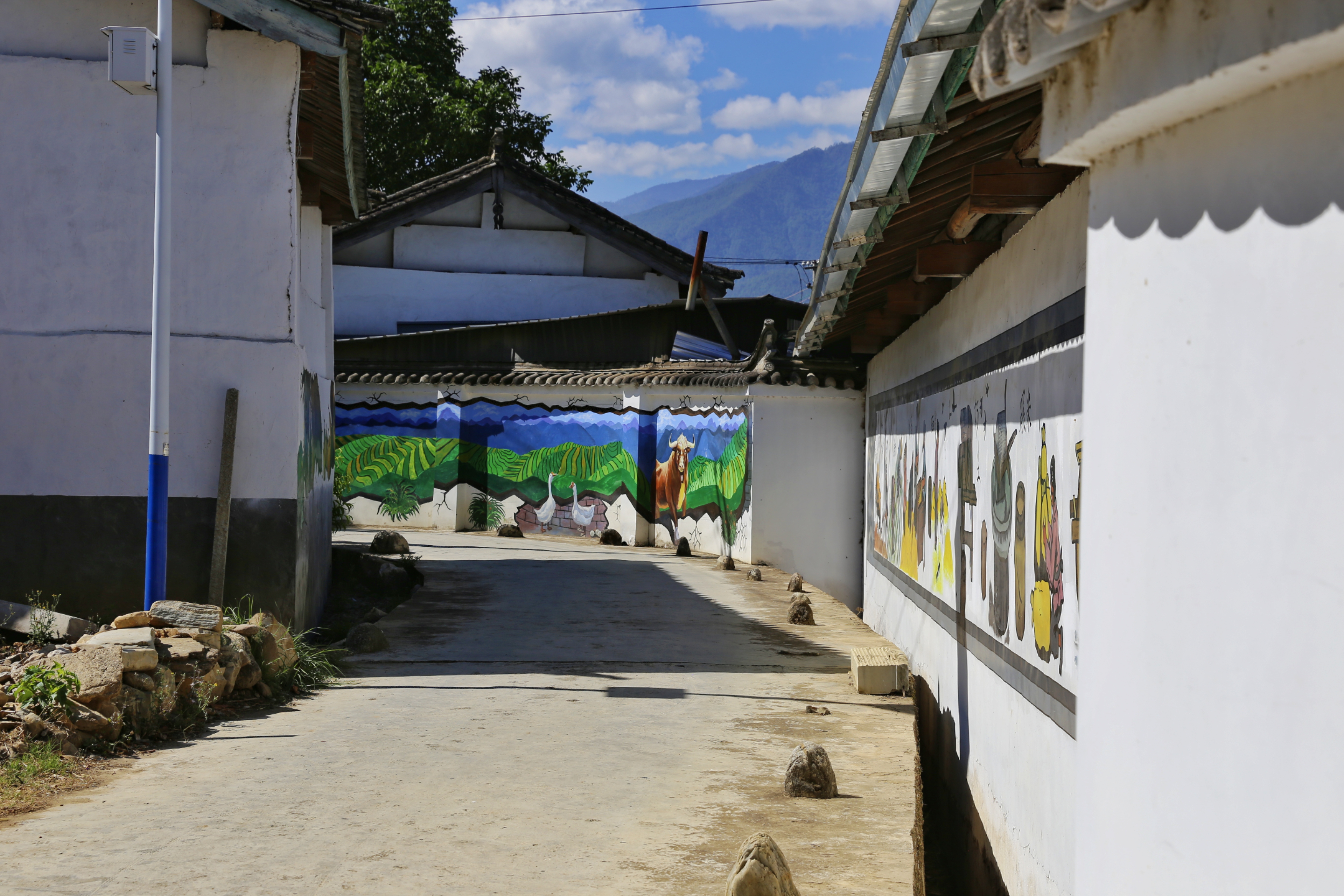 初夏時節(jié),走進香格里拉市金江鎮(zhèn)吾竹村堆滿一組,映入眼簾的是遠山青黛、碧水田園,房前屋后古樹紅花相映,鄉(xiāng)間小道兩側(cè)果樹成蔭,一幅幅包含該村文化歷史的彩繪躍然墻上,漫步其間好不愜意。