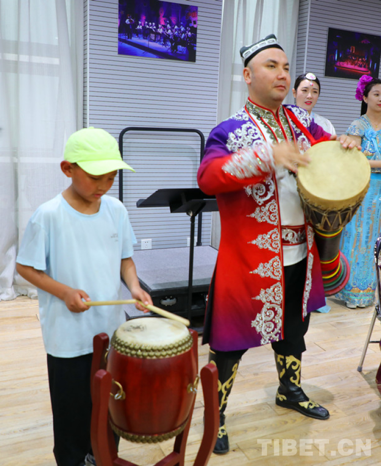 下午走進(jìn)中央民族歌舞團(tuán),孩子們感受到了不同的藝術(shù)氣氛。走過長(zhǎng)長(zhǎng)的走廊,墻上展示的表演圖片讓他們連連驚嘆。站在寬闊的舞臺(tái)上,感受聚光燈灑在身上的感覺。孩子們體驗(yàn)了從未見過的樂器,和聲樂老師唱起了家鄉(xiāng)的歌曲,也積極舞起了熟悉的鍋莊……與各位民族藝術(shù)家一起徜徉在歌舞藝術(shù)的海洋。