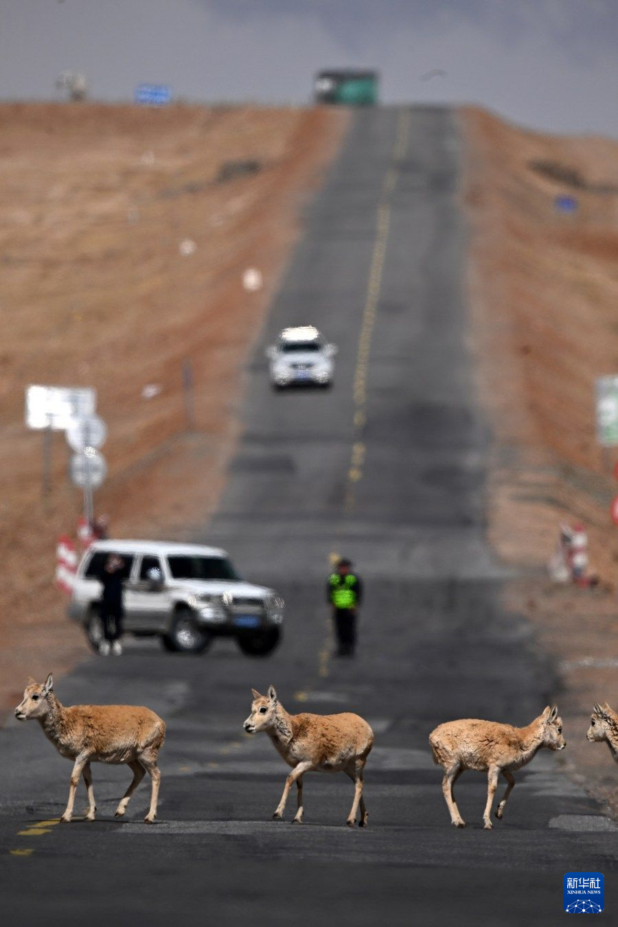眼下,可可西里藏羚羊進入遷徙產(chǎn)仔高峰期,記者近日在青藏公路3001公里處看到,成群的雌性藏羚羊在公路一側(cè)集結(jié),現(xiàn)場的工作人員對往來車輛進行臨時交通管制。頭羊反復試探、確認沒有危險后,羊群快速通過公路,向可可西里腹地奔去。