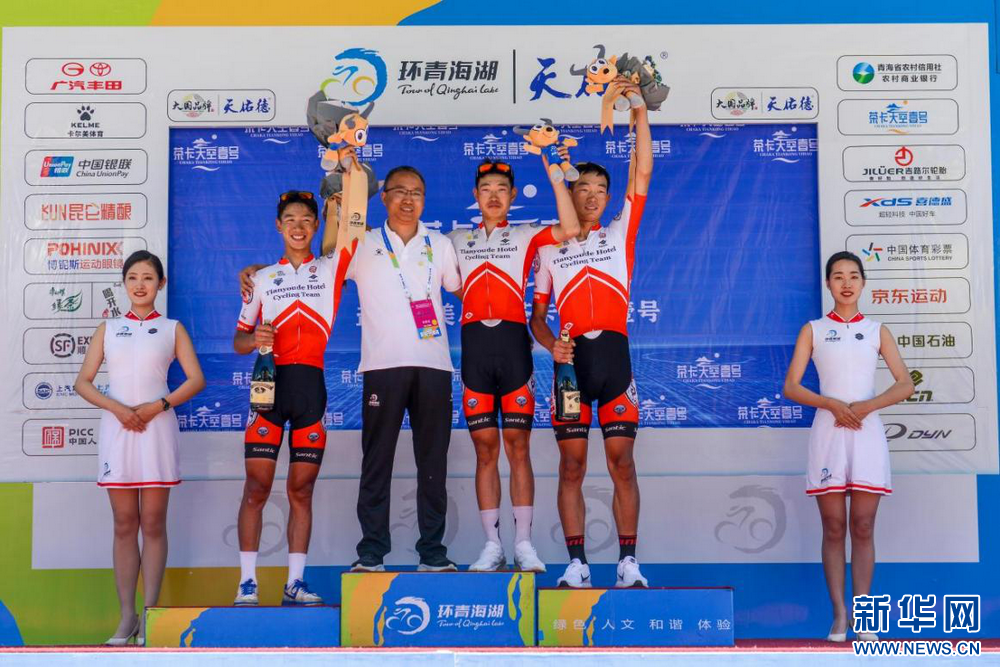 運(yùn)動員手拿吉祥物站在環(huán)湖賽領(lǐng)獎臺。環(huán)湖賽組委會供圖。