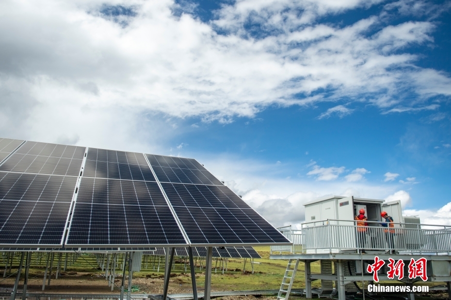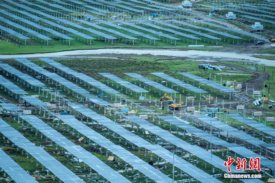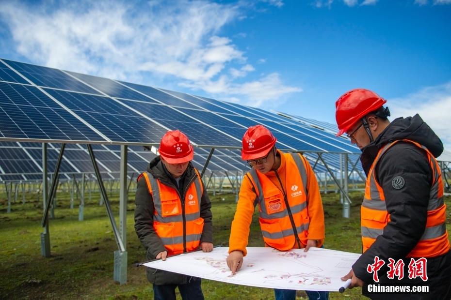 6月24日,建設者正在檢查光伏設備情況。(無人機照片)