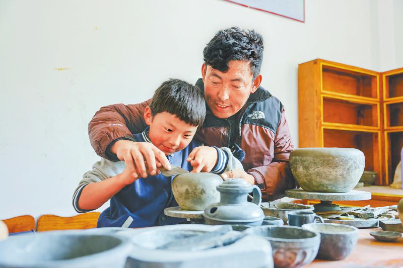 根呷火熱在教青少年制作土陶。洛絨尼瑪 攝