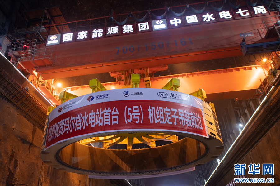 6月30日,瑪爾擋水電站首臺機(jī)組定子吊裝作業(yè)現(xiàn)場。新華網(wǎng) 潘彬彬 攝