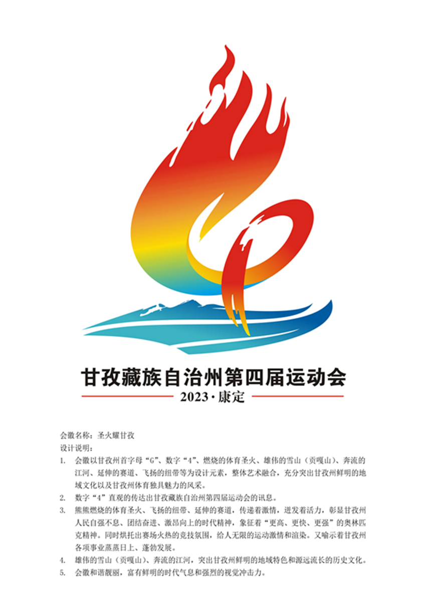 據(jù)王拓進介紹,會徽設計靈感來自網(wǎng)上看到的貢嘎雪山,所以作品以甘孜州首字母“G”、數(shù)字“4”、燃燒的體育圣火、雄偉的雪山(貢嘎山)、奔流的江河、延伸的賽道、飛揚的紐帶等為設計元素。數(shù)字“4”直觀地傳達出甘孜州第四屆運動會的訊息;雄偉的雪山(貢嘎山)、奔流的江河,突出甘孜州鮮明的地域特色和源遠流長的歷史文化;熊熊燃燒的體育圣火、飛揚的紐帶、延伸的賽道,傳遞著激情、迸發(fā)著活力,彰顯甘孜州人民自強不息、團結奮進、激昂向上的時代精神,象征著“更高、更快、更強”的奧林匹克精神,同時烘托出賽場火熱的競技氛圍,給人無限的運動激情和渲染,又喻示著甘孜州各項事業(yè)蒸蒸日上、蓬勃發(fā)展。