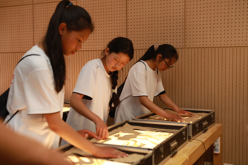 理塘青少年代表在錢塘區(qū)青少年活動(dòng)中心體驗(yàn)沙畫制作。